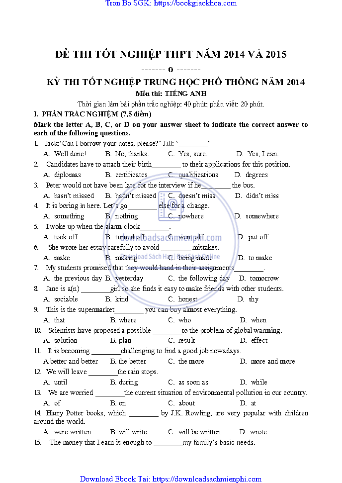 ĐỀ THI TỐT NGHIỆP THPT NĂM 2014 VÀ 2015