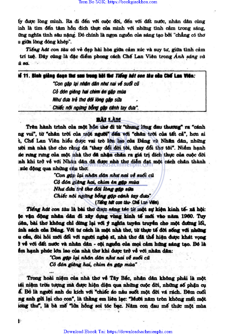 - ĐỀ 11: BÌNH GIẢNG ĐOẠN THƠ SAU TRONG BÀI THƠ TIẾNG HÁT CON TÀU CỦA CHẾ LAN VIÊN: “CON GẶP LẠI NHÂN DÂN NHƯ NAI VỀ SUỐI CŨ (…) CHIẾC NÔI NGỪNG BỖNG HÓA CÁNH TAY ĐƯA”.
