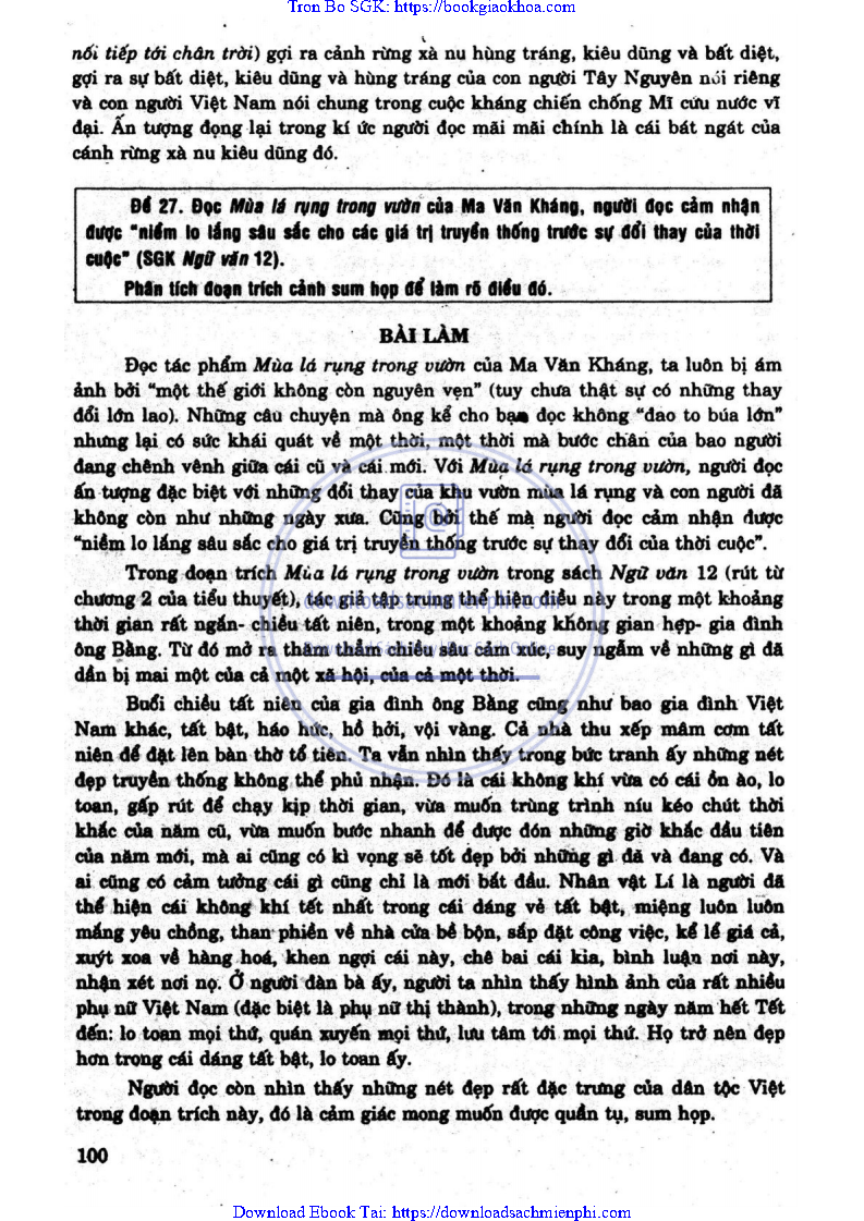 ĐỀ 27: ĐỌC MÙA LÁ RỤNG TRONG VƯỜNG CỦA MA VĂN KHÁNG, NGƯỜI ĐỌC CẢM NHẬN ĐƯỢC “NIỀM LO LẮNG SÂU SẮC CHO CÁC GIÁ TRỊ TRUYỀN THỐNG TRƯỚC SỰ ĐỔI THAY CỦA THỜI CUỘC” (SGK NGỮ VĂN 12). PHÂN TÍCH ĐOẠN TRÍCH CẢNH SUM HỌP ĐÊ LÀM RÕ ĐIỀU ĐÓ.