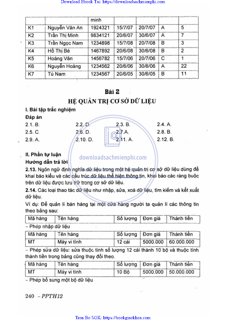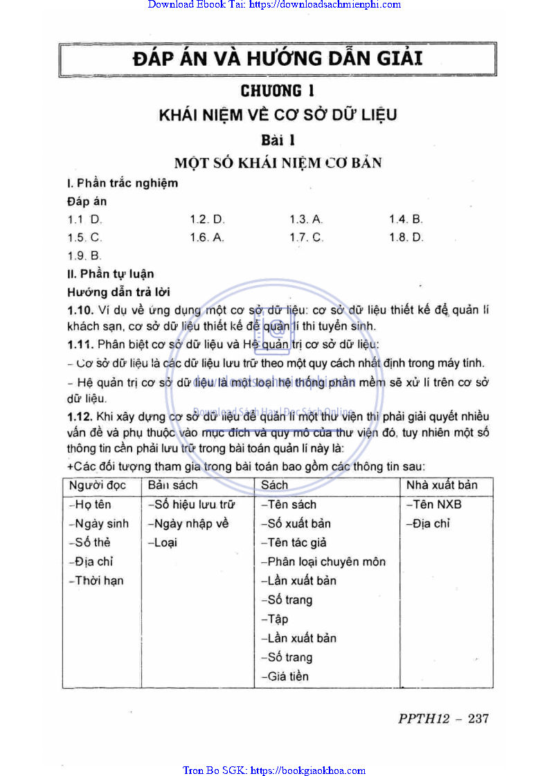 ĐÁP ÁN VÀ HƯỚNG DẪN GIẢI CHƯƠNG 1. KHÁI NIỆM VỀ CƠ SỞ DỮ LIỆU VÀ HỆ QUẢN TRỊ CƠ SỞ DỮ LIỆU