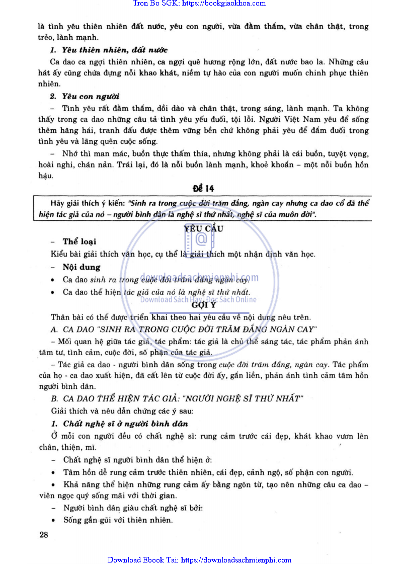 - ĐỀ 16. HÃY GIẢI THÍCH Ý KIẾN: “SINH RA TRONG CUỘC ĐỜI TRĂM ĐẮNG, NGÀN CAY NHƯNG CA DAO CỔ ĐÃ THỂ HIỆN TÁC GIẢ CỦA NÓ – NGƯỜI BÌNH DÂN LÀ NGHỆ SĨ THỨ NHẤT, NGHỆ SĨ CỦA MUÔN ĐỜI”