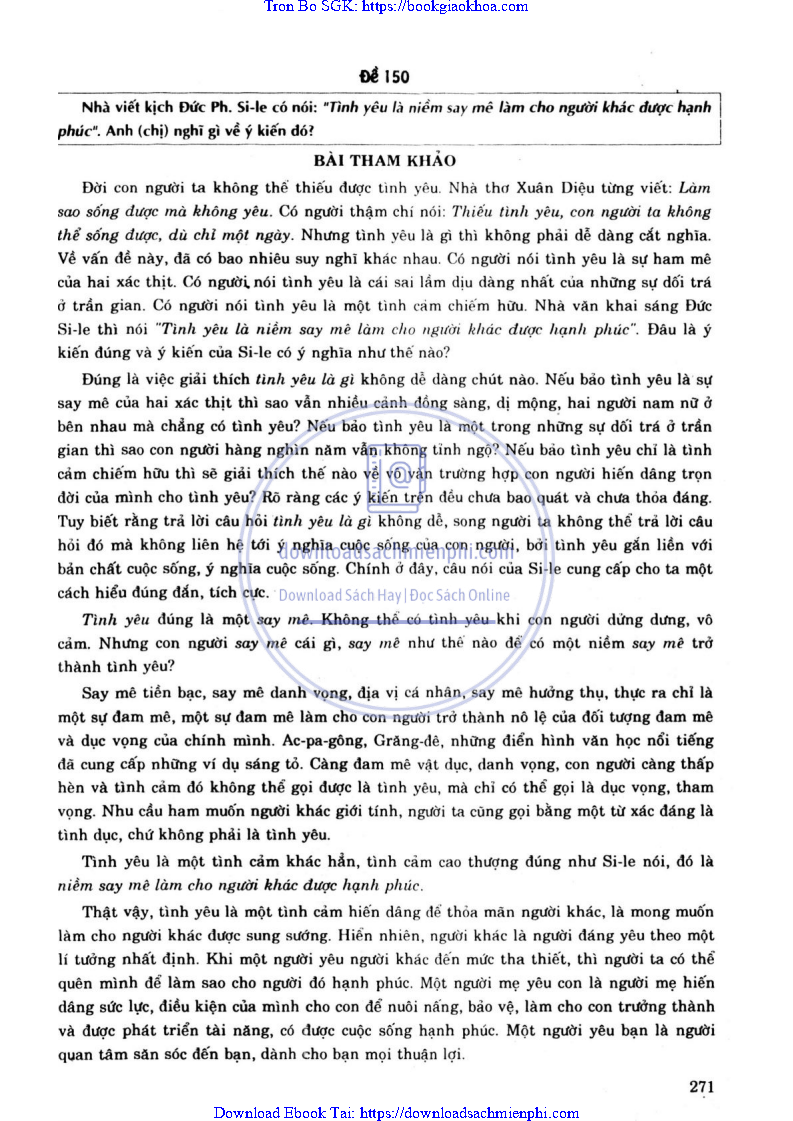 ĐỀ 154. NHÀ VIẾT KỊCH ĐỨC PH. SI-LE CÓ NÓI: “TÌNH YÊU LÀ NIỀM SAY MÊ LÀM CHO NGƯỜI KHÁC ĐƯỢC HẠNH PHÚC”. ANH (CHỊ) NGHĨ GÌ VỀ Ý KIẾN ĐÓ