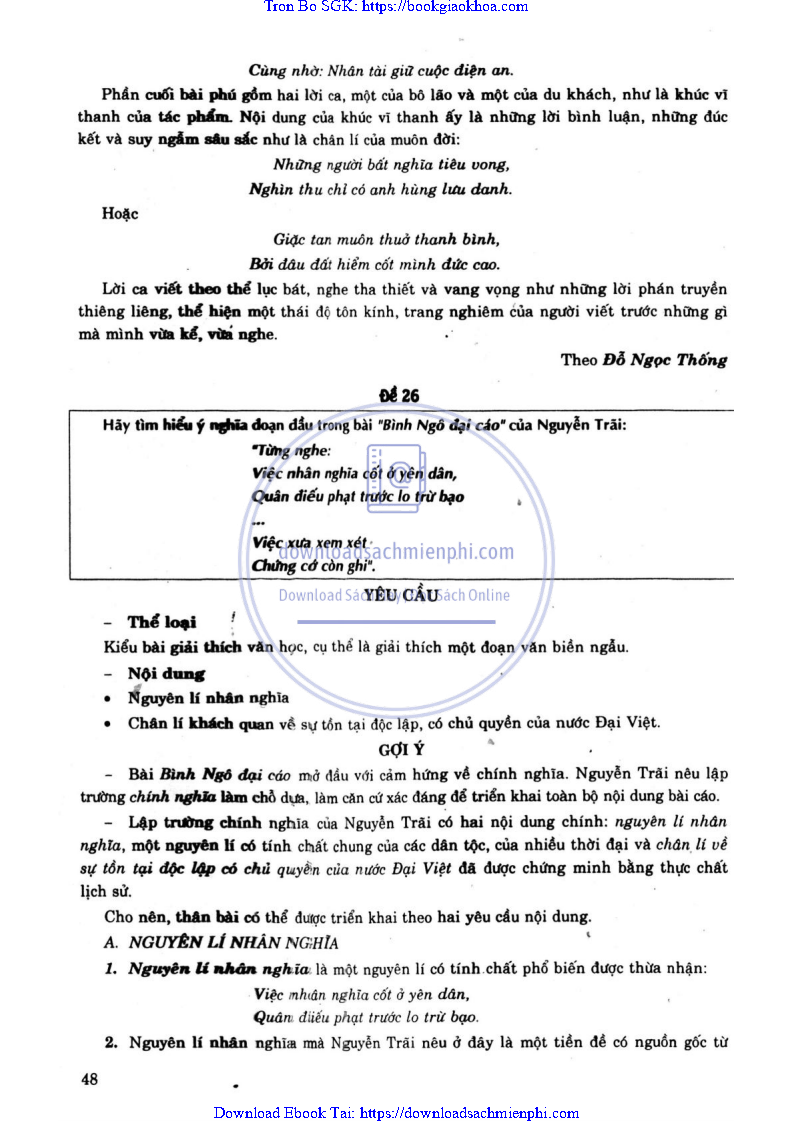 - ĐỀ 32. NÓI VỀ “BÌNH NGÔ ĐẠI CÁO”, TRONG DIỄN VĂN TẠI LỄ KỈ NIỆM 600 NĂM NĂM SINH NGUYỄN TRÃI, ÔNG VÕ NGUYÊN GIÁP ĐÃ NHẬN ĐỊNH: “BÌNH NGÔ ĐẠI CÁO” CÓ GIÁ TRỊ NHƯ BẢN TUYÊN NGÔN ĐỘC LẬP LẦN THỨ HAI CỦA NƯỚC ĐẠI VIỆT… “BÌNH NGÔ ĐẠI CÁO” CÒN LÀ MỘT BẢN TUYÊN NGÔN NHÂN ĐẠO VÀ HÒA BÌNH CỦA NHÀ NƯỚC ĐẠI VIỆT. HÃY PHÂN TÍCH “BÌNH NGÔ ĐẠI CÁO” CỦA NGUYỄN TRÃI ĐỂ LÀM SÁNG TỎ NHẬN ĐỊNH TRÊN