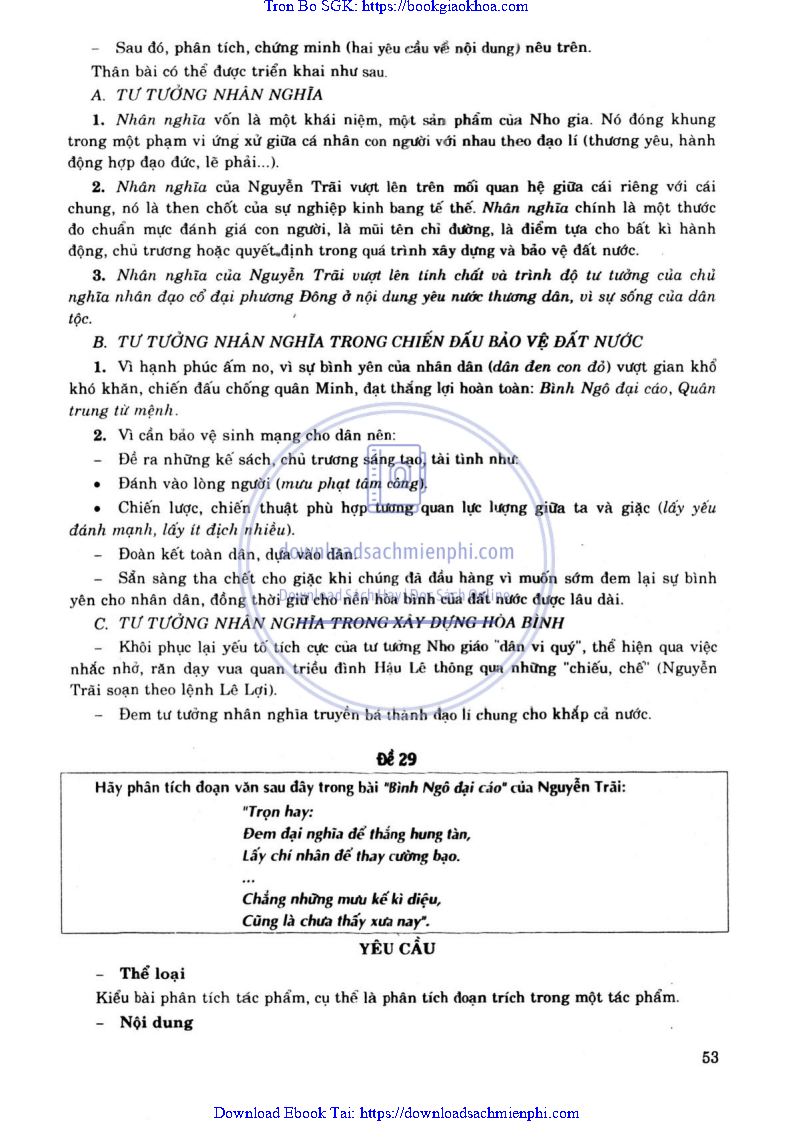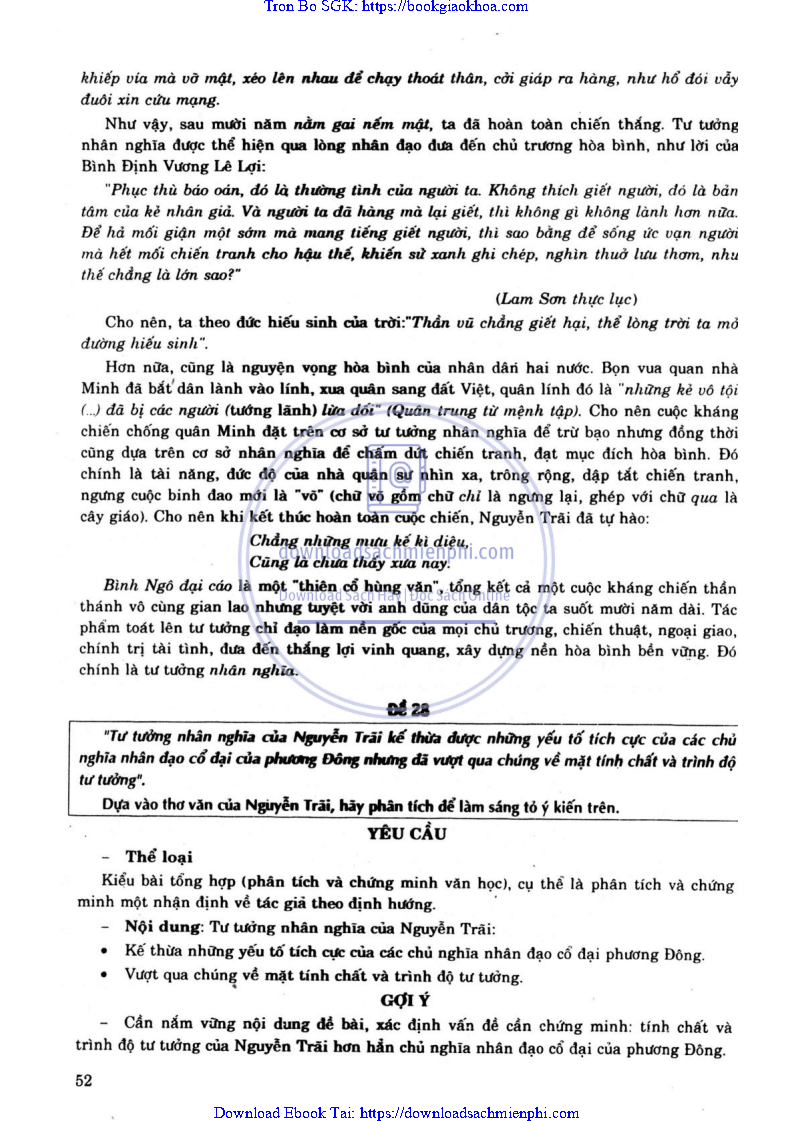 - ĐỀ 29. “TƯ TƯỞNG NHÂN NGHĨA CỦA NGUYỄN TRÃI KẾ THỪA ĐƯỢC NHỮNG YẾU TỐ TÍCH CỰC CỦA CHỦ NGHĨA NHÂN ĐẠO CỔ ĐẠI CỈA PHƯƠNG ĐÔNG NHƯNG ĐÃ VƯỢT QUA CHÚNG VỀ MẶT TÍNH CÁCH VÀ TRÌNH ĐỘ TƯ TƯỞNG”. DỰA VÀO THƠ VĂN CỦA NGUYỄN TRÃI. HÃY PHÂN TÍCH ĐỂ LÀM SÁNG TỎ Ý KIẾN TRÊN