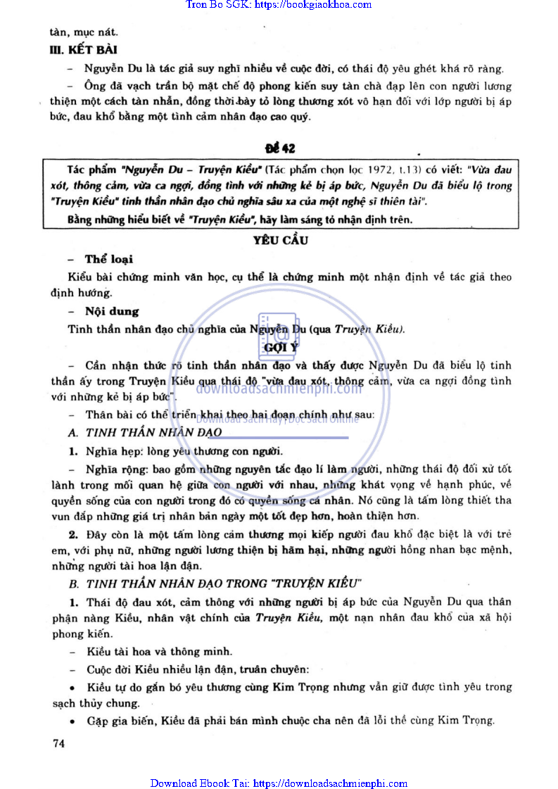 ĐỀ 46. TÁC PHẨM “NGUYỄN DU – TRUYỆN KIỀU” (TÁC PHẨM CHỌN LỌC 1972, TRANG 13) CÓ VIẾT: “VỪA ĐAU XÓT, THÔNG CẢM, VỪA CA NGỢI, ĐỒNG TÌNH VỚI NHỮNG KẺ BỊ ÁP BỨC, NGUYỄN DU ĐÃ BIỂU LỘ TRONG “TRUYỆN KIỀU” TINH THẦN NHÂN ĐẠO CHỦ NGHĨA SÂU XA CỦA MỘT NGHỆ SĨ THIÊN TÀI”. BẰNG NHỮNG HIỂU BIẾT VỀ “TRUYỆN KIỀU”. HÃY LÀM SÁNG TỎ NHẬN ĐỊNH TRÊN